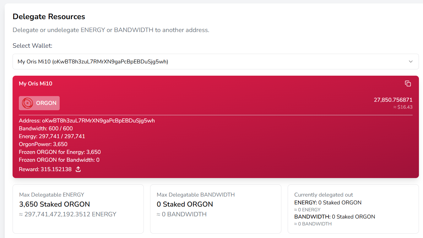 Теперь владелец кошелька с большим количеством ORGON может заморозить их для получения ресурсов Energy или Bandwidth и указать адрес другого кошелька, которому эти ресурсы делегируются.